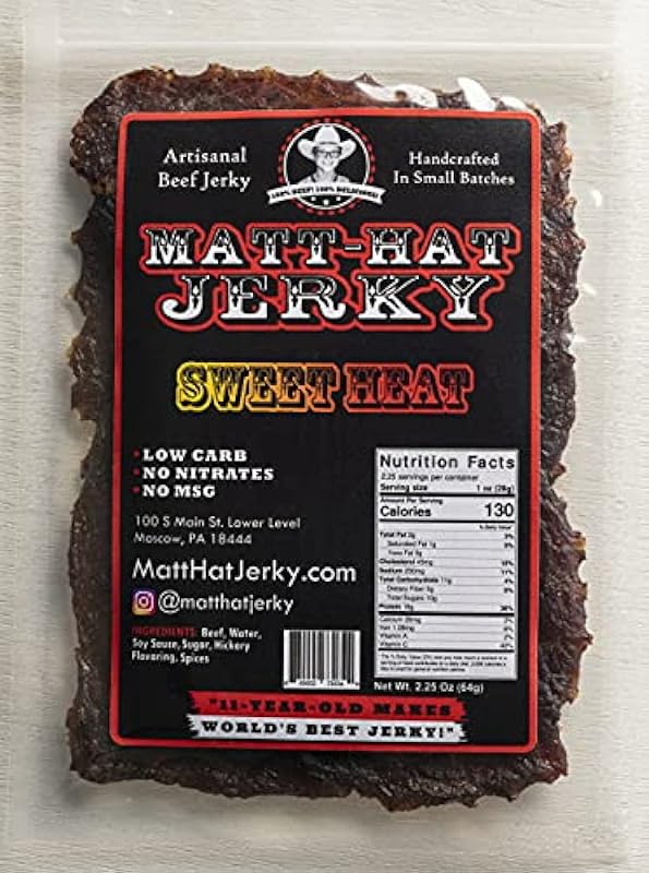 Matt-Hat Sweet Heat Artisanal Beef Jerky made with Soy Sauce, Hickory Flavoring & Premium Beef - Low Carb & Gluten Free with No Nitrates or MSG 12 oz. Bags 775011483