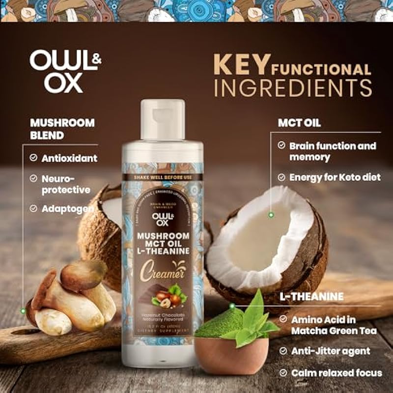 Mushroom Coffee Creamer with MCT Oil by Owl & Ox | L Theanine, Nootropic Superfood Blend, Vegan, Sugar Free, Dairy Free, Adaptogens, Plant Based & Keto Friendly, Hazelnut Chocolate, 30 Servings 651568213