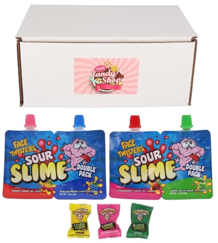 Face Twisters Sour Slime Liquid Gel Candy Variety Pack of 4 Flavors (Cherry, Blue Raspberry, Strawberry, Green Apple) + 3 free Warheads Candies (1 of each) 172380811