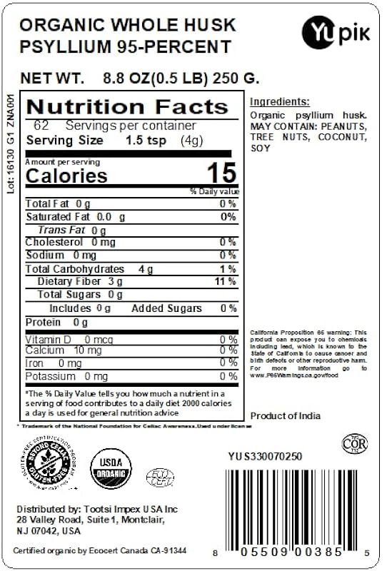 Yupik Organic Whole Husk Psyllium 95% Superfood, 8.8 Ounce, Non-GMO, Vegan, Gluten-Free 172130272