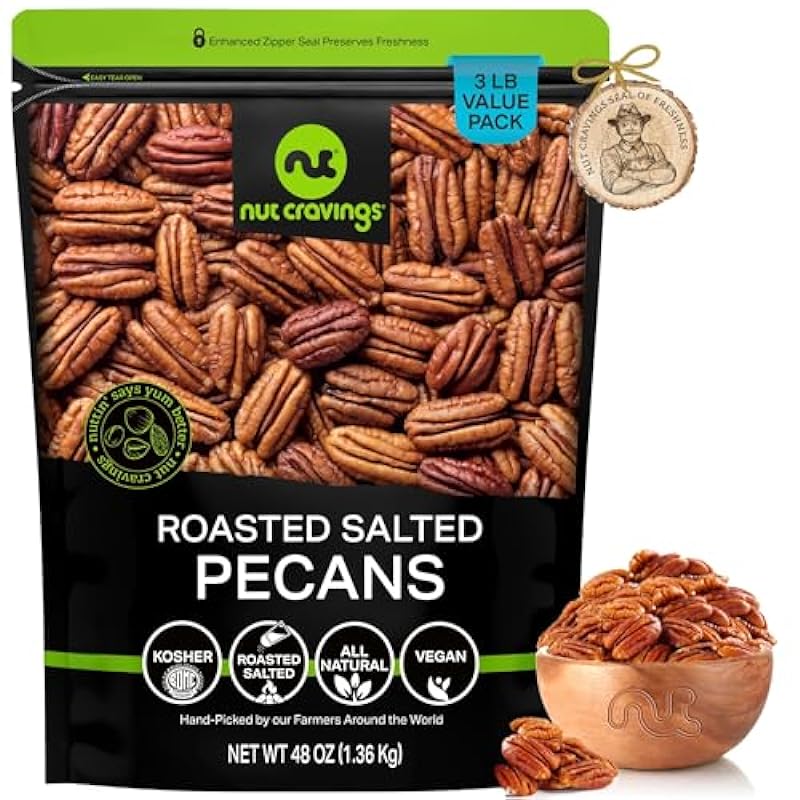 Nut Cravings - Pecans Halves, Roasted & Salted, No Shell (48oz - 3 LB) Bulk Nuts Packed Fresh in Resealable Bag - Healthy Protein Food Snack, All Natural, Keto Friendly, Vegan, Kosher 43832045