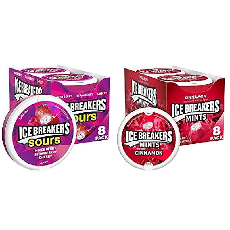 ICE BREAKERS Sours Sugar Free Mints, (Mixed Berry, Strawberry, Cherry) 1.5 Ounce (Pack of 8) & Sugar Free Mints, Cinnamon, 1.5 Ounce (Pack of 8) 909664375