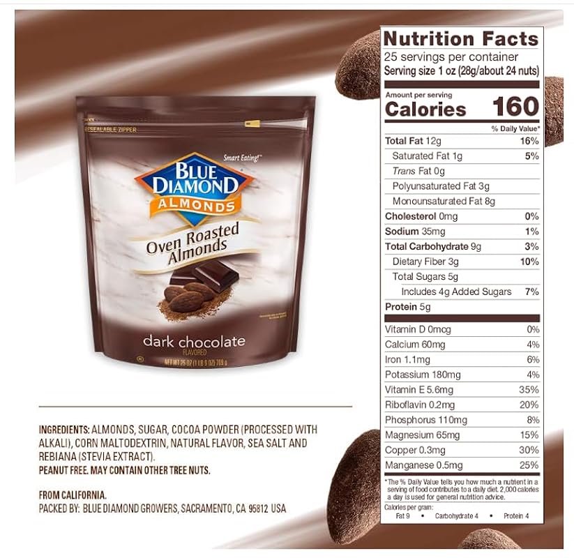 - Contains one 25-ounce bag of Blue Diamond oven roasted dark chocolate snack almonds