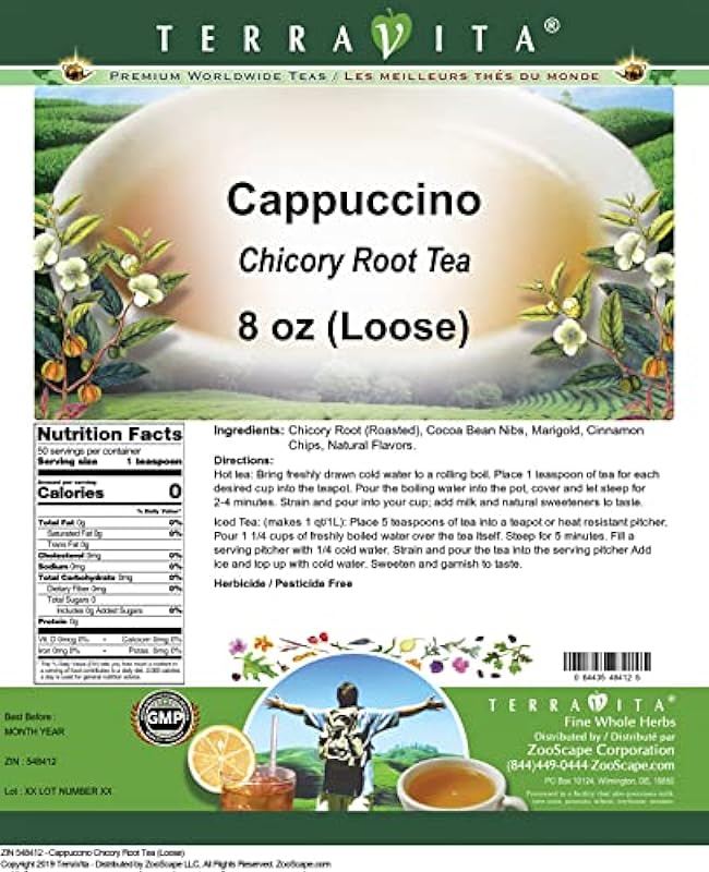 - Our Cappuccino Chicory Root tea is a delicious flavored Chicory Root coffee alternative with Cocoa Bean Nibs, Marigold and Cinnamon Chips that you will really enjoy! The unique and caffeine-free Cappuccino aroma and taste is a delight! – Ingredients: Chicory Root, Cocoa Bean Nibs, Marigold, Cinnamon Chips and Natural Cappuccino Flavor.