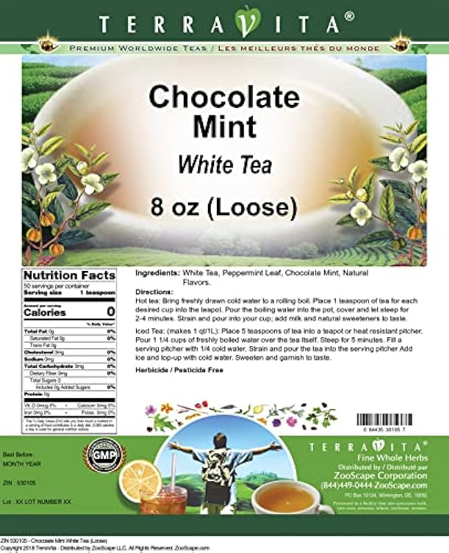 - Our Chocolate Mint White Tea is a mouthwatering flavored White tea you will enjoy anytime! – Ingredients: White tea, Peppermint Leaf, Chocolate Mint and natural chocolate mint flavor.