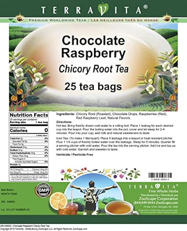 - Our Chocolate Raspberry Chicory Root tea is a delicious flavored Chicory Root coffee alternative with Chocolate Drops, Raspberries (Red) and Raspberry Leaf (Red) that you will really enjoy! The unique and caffeine-free Chocolate Raspberry aroma and taste is a delight! – Ingredients: Chicory Root, Chocolate Drops, Raspberries (Red), Raspberry Leaf (Red) and Natural Chocolate Raspberry Flavor.
