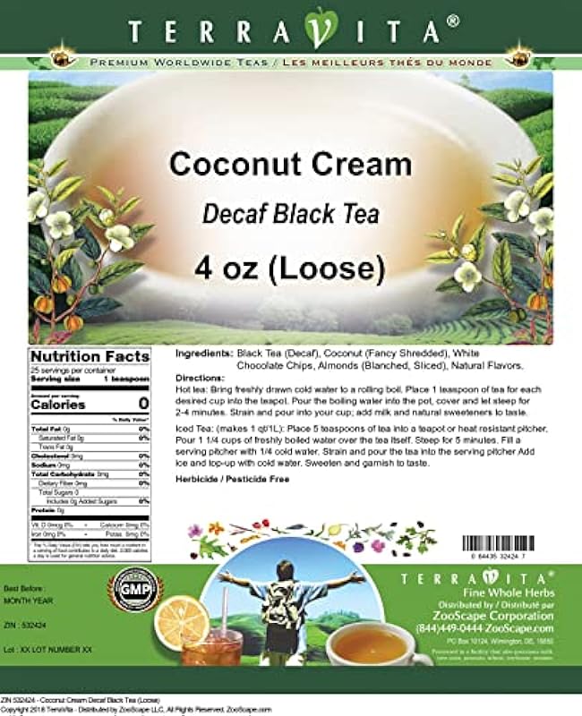 - Our Coconut Cream Decaf Black Tea is a wonderful flavored decaffeinated Black tea with Coconut, White Chocolate Chips and Almonds. You will enjoy the simple and elegant Coconut Cream taste! – Ingredients: Decaf Black tea, Coconut, White Chocolate Chips, Almonds and Natural Coconut Cream Flavor.