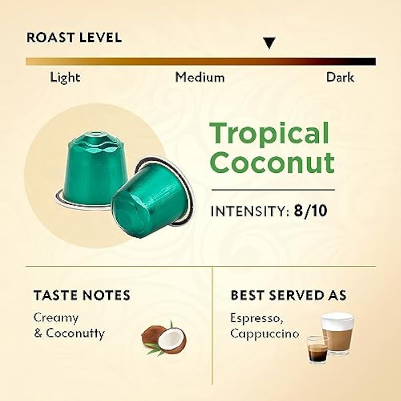 - Tropical Coconut Flavored Coffee Pods – Our expertly crafted Tropical Coconut Flavored coffee is curated with medium-dark roasted Arabica beans and coconut flavoring, creating a deliciously smooth, nutty and creamy tasting coffee that will whisk you away to a tropical paradise.