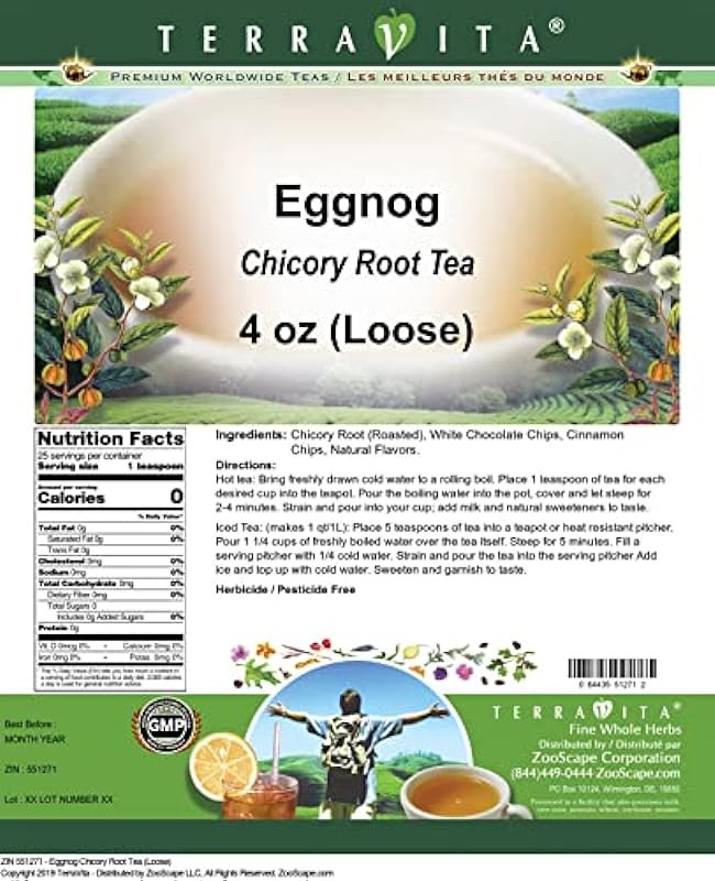 - Our Eggnog Chicory Root tea is a delicious flavored Chicory Root coffee alternative with White Chocolate Chips and Cinnamon Chips that you will really enjoy! The unique and caffeine-free Eggnog aroma and taste is a delight! – Ingredients: Chicory Root, White Chocolate Chips, Cinnamon Chips and Natural Eggnog Flavor.