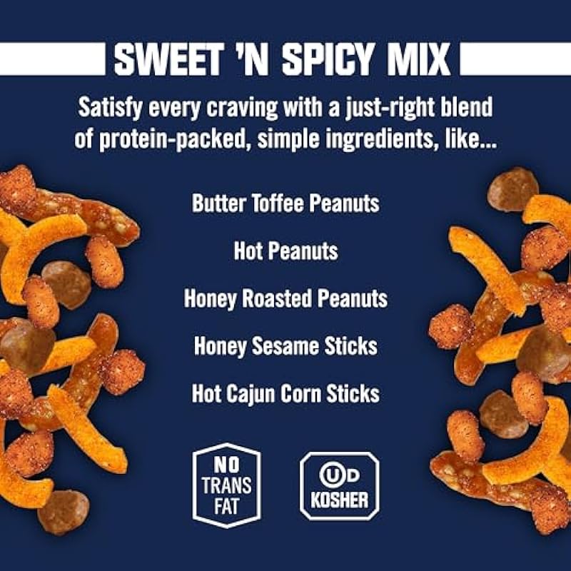 - SWEET ‘N SPICY – Featuring crunchy butter toffee coated peanuts, roasted and seasoned spicy peanuts, honey roasted peanuts, Cajun corn sticks and honey sesame sticks, your mouth with savor the blend of mellow sweetness and a little hot-cha-cha.