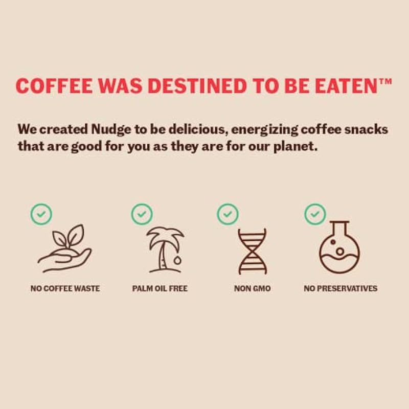 - ENERGY BOOSTING FOOD: Nudge provides the best form of energy – all-natural caffeine from the coffee bean. Enjoy these coffee snacks anytime, anywhere.