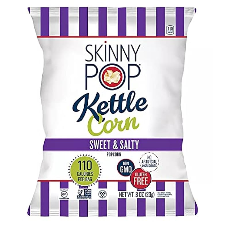 - SkinnyPop Popcorn Variety Snack Pack contains 35 individual snack-sized bags: 12 Original Popcorn (0.5 oz.) bags, 12 Sweet and Salty Kettle Corn Popcorn (0.5 oz.) bags, and 12 Dairy-Free White Cheddar Popcorn (0.5 oz.) bags.
