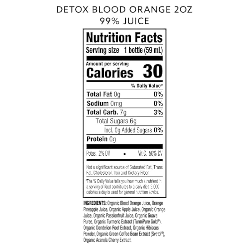 - This Detox Shot supports your body’s natural detoxification with a delightful blend of blood orange and hibiscus, while combining the power of turmeric, dandelion root, coffee extract, and acerola cherry.