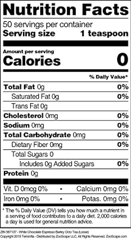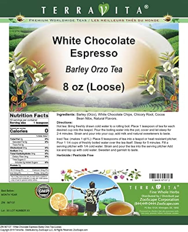 - Our White Chocolate Espresso Barley Orzo tea is a tasty naturally flavored Barley Orzo roasted grain beverage (coffee substitute) with White Chocolate Chips, Chicory Root and Cocoa Bean Nibs that has a refreshing natural taste that will impress you! The unique White Chocolate Espresso taste is delicious! – Ingredients: Barley Orzo, White Chocolate Chips, Chicory Root, Cocoa Bean Nibs and Natural White Chocolate Espresso Flavor.